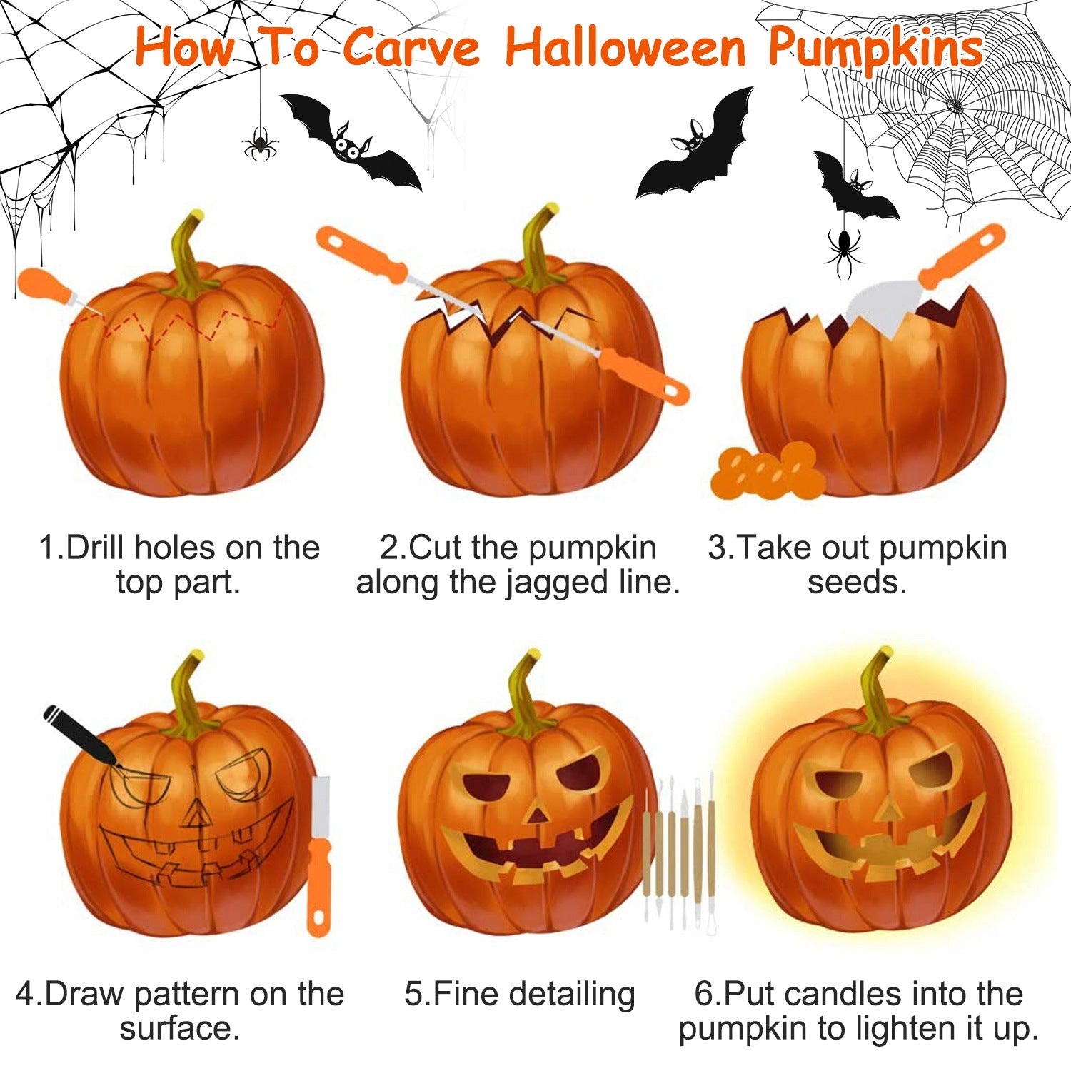 - * All-In-One Carving Kit *: This 13pcs pumpkin carving kit features a scooper,a drill,etching tools,double-sided and fine-toothed saws,double-sided sculpting tools. You get everything you need for cutting,slicing,sawing,scooping,etching the perfect pumpkin to display in or outside your home.